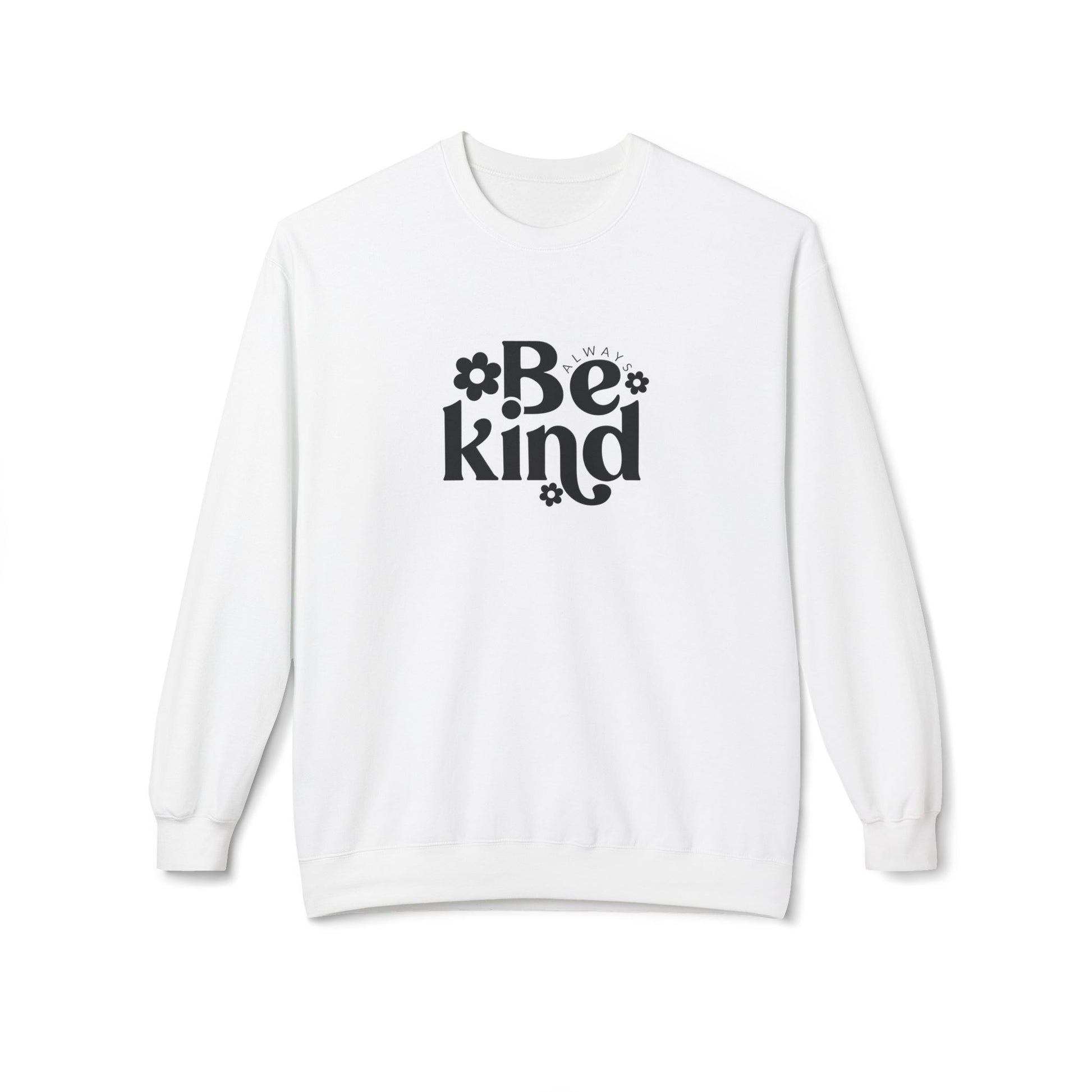 Soft, steady, and quietly optimistic — this midweight crew sweatshirt wears its gentle message on the chest. The clean “Be kind” graphic with simple floral accents sits centered and calm, designed to pair with early-morning coffee runs, neighborhood walks, or slow weekends with a book. The dropped shoulders and classic fit give it an easy, lived-in silhouette that layers effortlessly over tees or under a coat. Built from a substantial cotton-blend fabric, it holds shape while offering cozy warmth without bulk. Wear it when you want your clothing to echo a calm, thoughtful mood and to invite small, kind moments into an ordinary day.