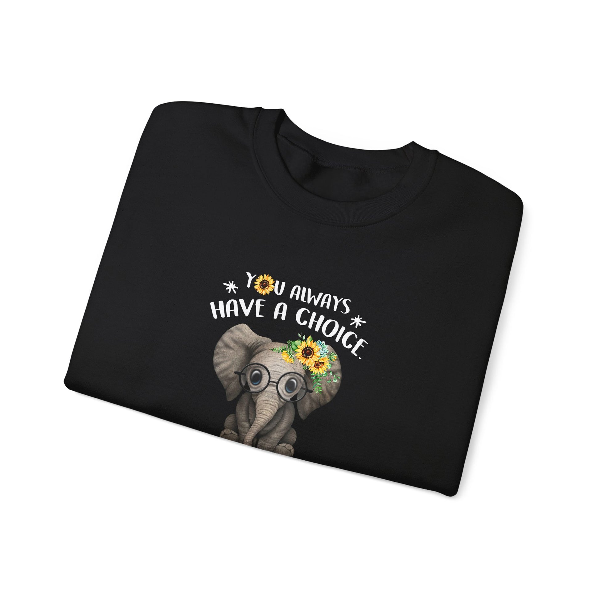 Soft, roomy, and quietly uplifting — this crewneck follows you through slow mornings, library afternoons, and cozy evenings at home. A gentle elephant illustration wears round glasses and a sunflower, and the words “You always have a choice — choose kindness” sit beneath it. The design feels hand-drawn and warm, inviting small acts of care into everyday life. Stitching and fabric weight keep the shape while the brushed interior holds heat without stiffness. Wear it layered over a tee on crisp days or alone when you want a calm reminder to move through the world with patience and compassion.
