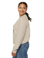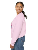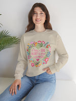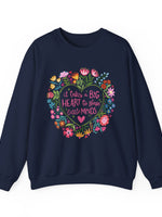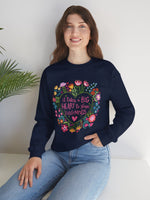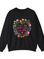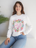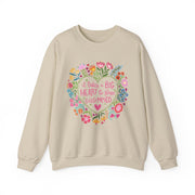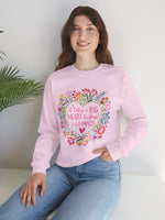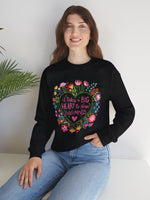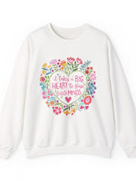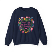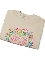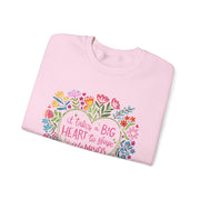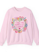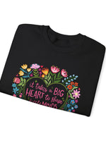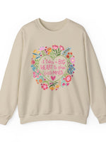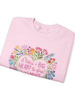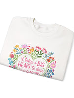 A soft, cozy crewneck with a hand-drawn, floral heart design that celebrates kindness and care. The artwork — a wreath of watercolor-style blooms surrounding the handwritten message “It takes a BIG HEART to shape little...