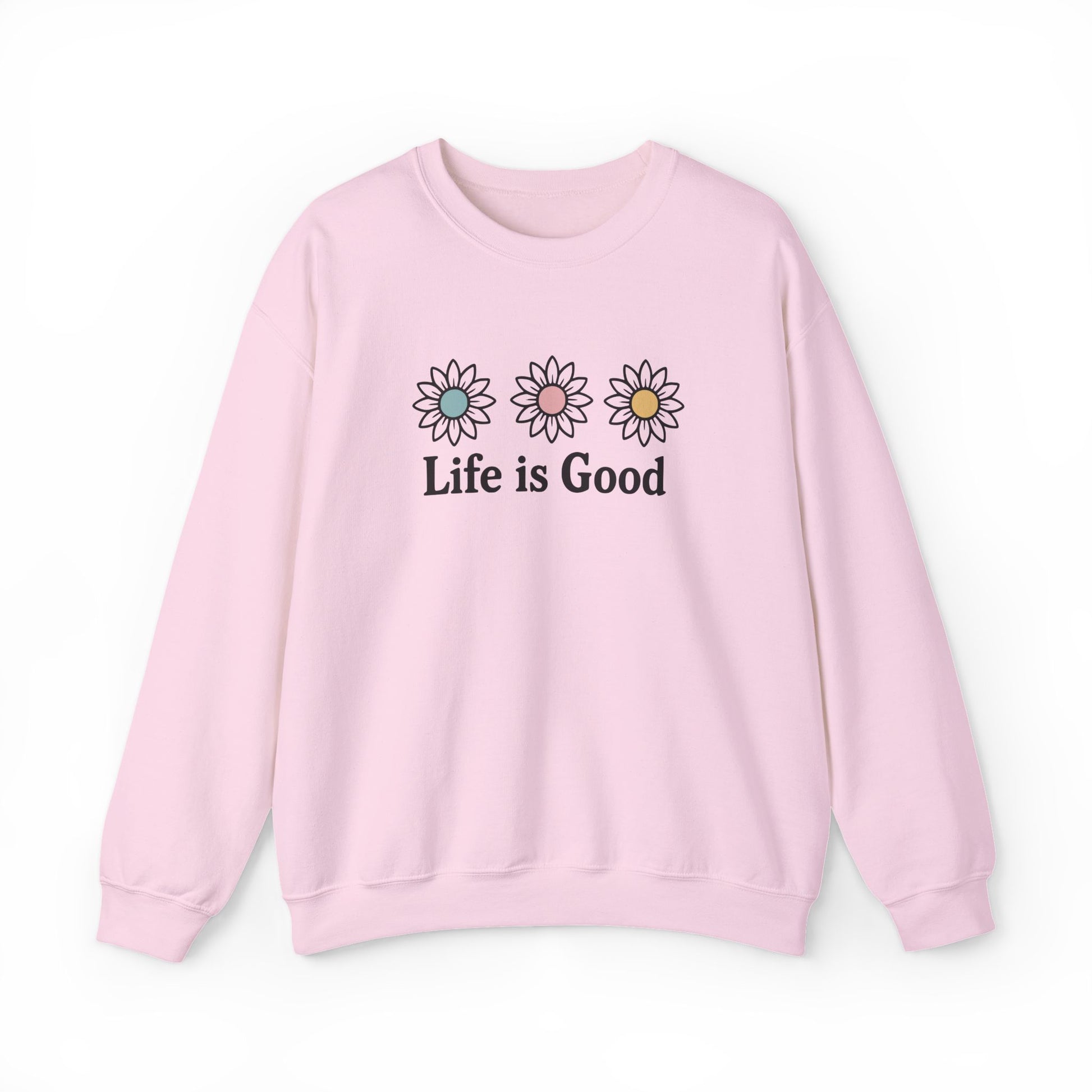 Soft, midweight crewneck sweatshirt with a gentle, uplifting design — three hand-drawn daisies in pastel tones above the phrase “Life is Good.” The relaxed, classic fit and crew neckline make it an easy layer for slow mornings, coffee runs, or quiet evenings at home. Wear it on crisp walks through town or layered over a favorite tee when you want a little calm and optimism in your day. Subtle embroidery or printed details keep the look clean and approachable while the tear-away label and double-needle stitching ensure comfort that lasts. Ethically sourced cotton and OEKO-TEX certified dyes add a thoughtful touch for those who care about materials and durability.