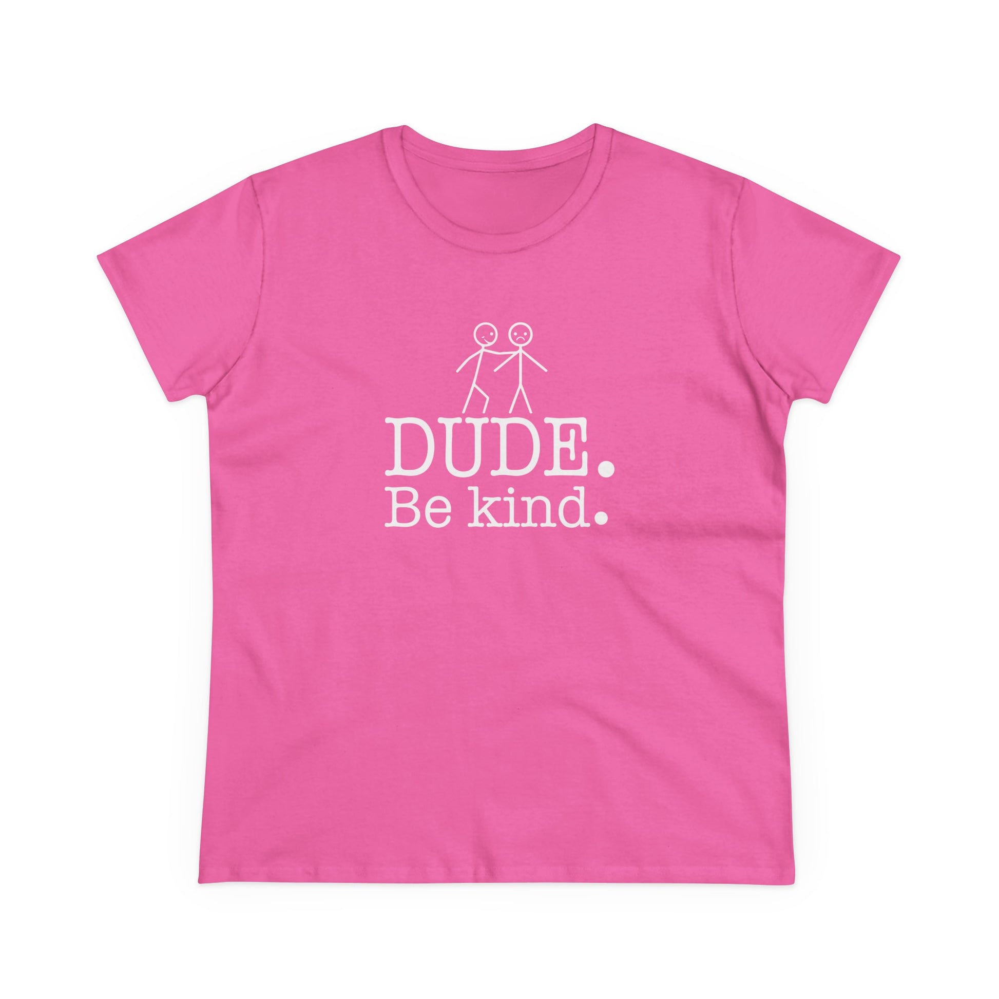 Quiet confidence on a simple tee. This midweight cotton shirt carries a small, hand-drawn stick-figure moment above the bold line: “DUDE. Be kind.” It reads like a friendly reminder — casual, conversational, and honest — for people who want to wear their values without shouting. The semi-fitted cut and medium-weight fabric sit comfortably for everyday wear, while side seams and reinforced neck and shoulders keep the shape wash after wash. Put it on for a coffee run, a community meetup, or a slow weekend walk; it settles into everyday life and starts low-key conversations about kindness.