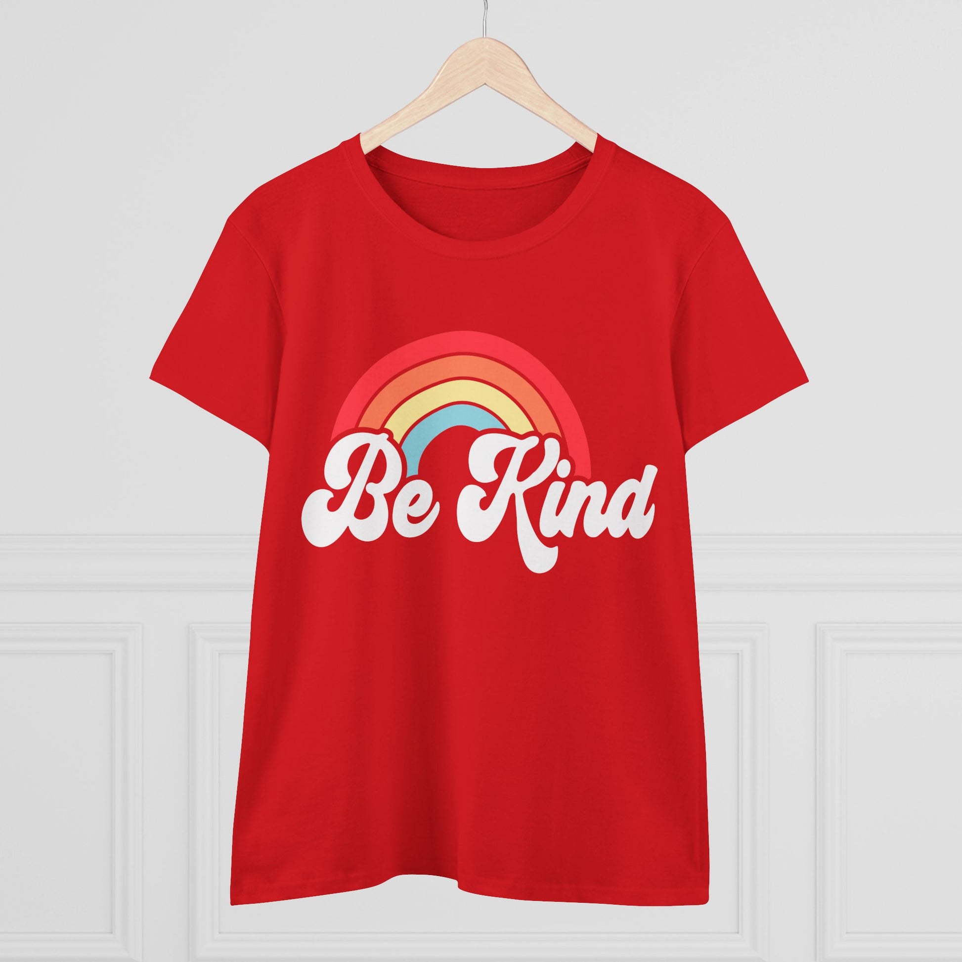 Soft, midweight tee with a warm, retro message. The vintage-style rainbow and flowing “Be Kind” script sit across the chest in soft, muted tones that feel both cheerful and gentle. The shirt drapes semi-fitted on the body and moves easily from morning coffee runs to relaxed afternoons with friends. It’s the kind of top you reach for when you want to share a little warmth without saying a word — bright but laid-back, familiar but thoughtful. Wear it to spread calm energy at community events, casual meet-ups, or quiet days at home.